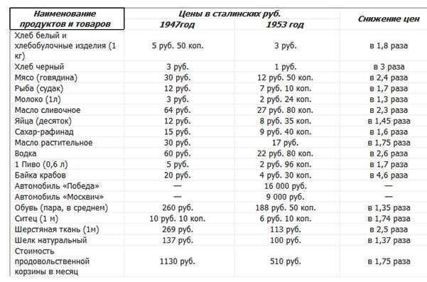 Регулярное послевоенное сталинское снижение цен на продукты и промышленные товары проводилось 16 декабря 1947 г., 10 апреля 1948 г., 1 марта 1949 г., 1 марта 1950 г., 1 марта 1951 г., 1 апреля 1952 г., 1 апреля 1953 г. и 1 апреля 1954 г.