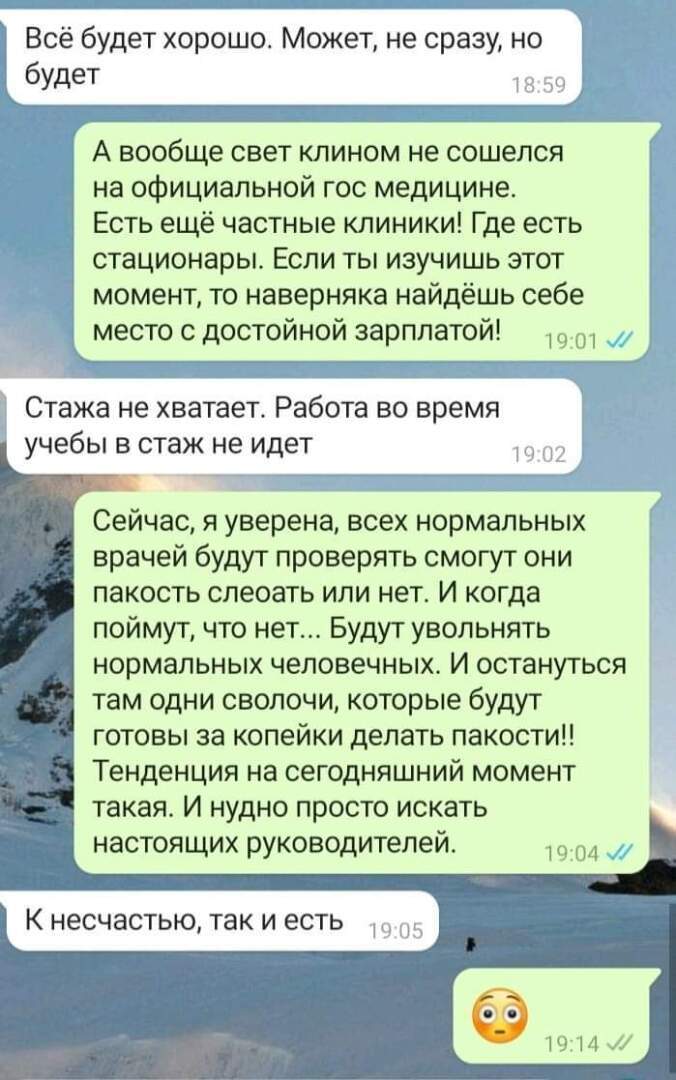 Я: А вообще свет клином не сошелся на официальной гос медицине. Есть ещё частные клиники! Где есть стационары. Если ты изучишь этот момент, то наверняка найдёшь себе место с достойной зарплатой!