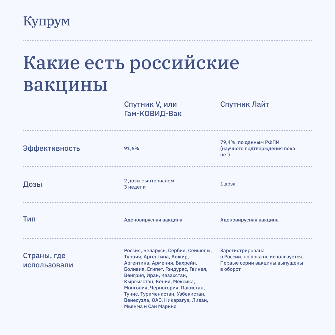 Кратко. Среди российских вакцин данные о безопасности и эффективности есть только для «Спутника V». В отношении вакцин «Спутник Лайт», «ЭпиВакКорона», «КовиВак» пока нет надежных данных, чтобы можно было их рекомендовать.
