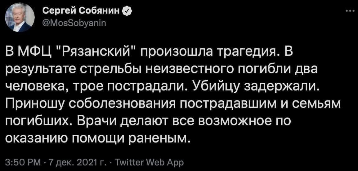 На юго-востоке Москвы посетитель МФЦ "Рязанский" открыл огонь и убил двоих человек, еще четверых ранил. Убийца — 45-летний Сергей Глазов, он ранее служил в Службе Внешней Разведке РФ.
