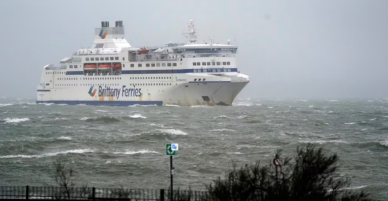 Паром Brittany Ferries Normandie ​​прибывает в Портсмут, когда Storm Barra обрушивается на Великобританию.