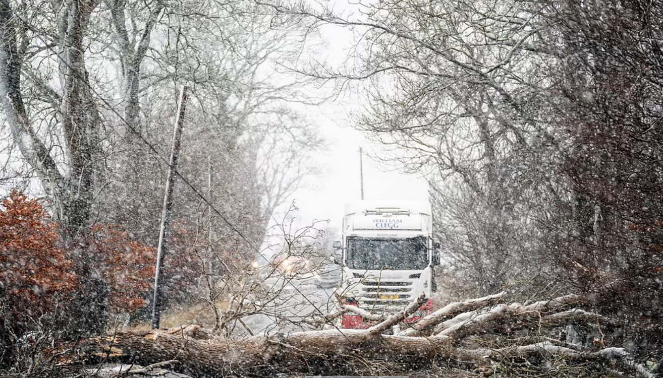 Упавшее дерево блокирует трассу A702 возле Колтера в Южном Ланаркшире сегодня днем, когда шторм Барра обрушился на Великобританию и Ирландию.