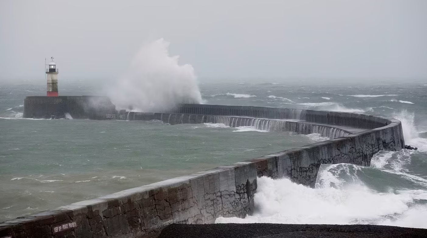 Сильный ветер и высокие волны наблюдаются сегодня днем ​​в Ньюхейвене в Восточном Сассексе, когда Шторм Барра достигает Великобритании.