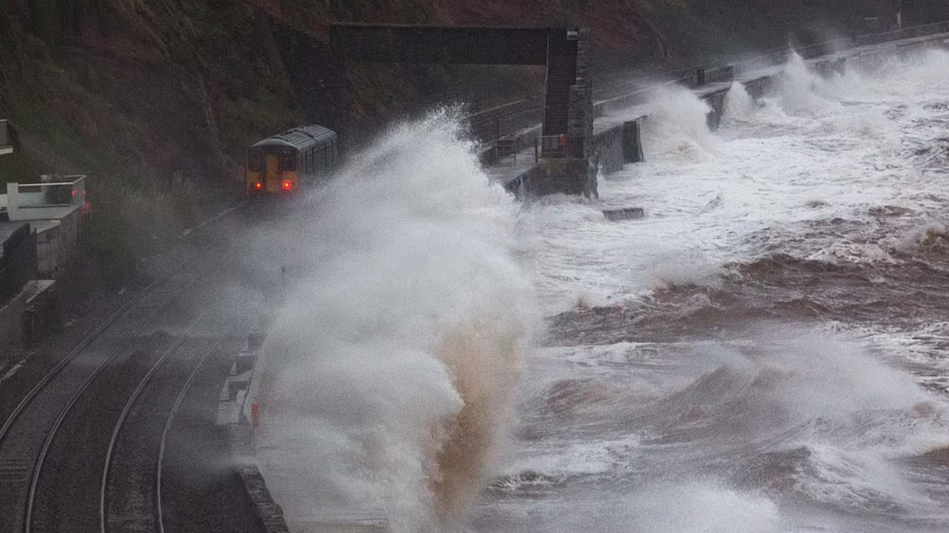 Сегодня утром огромные волны разбиваются о набережную в Долиш в Девоне, когда поезд движется по прибрежной железной дороге.