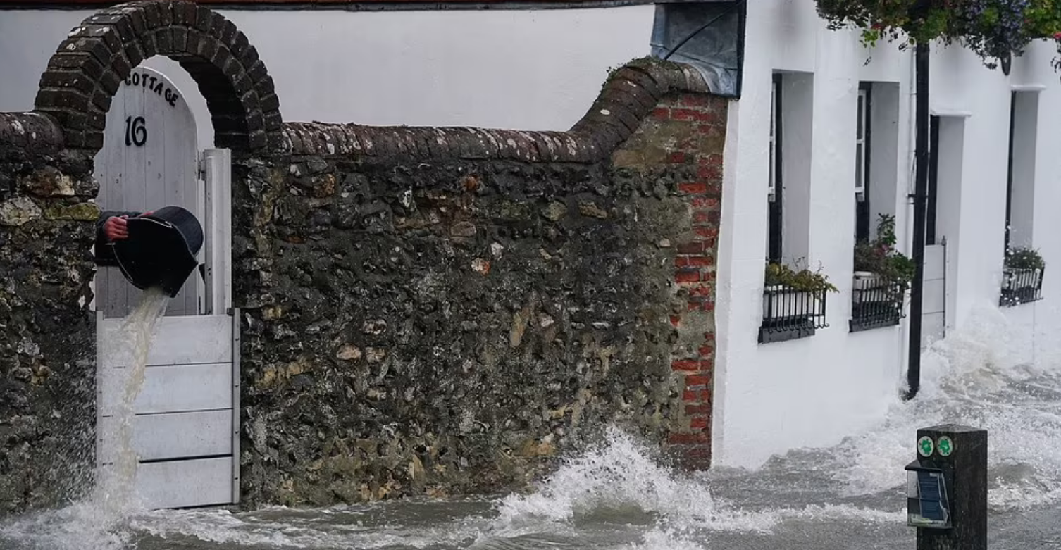 Человек выкачивает воду из дома, когда морская вода затопляет береговую линию после прилива в Лэнгстоне, графство Хэмпшир, сегодня.