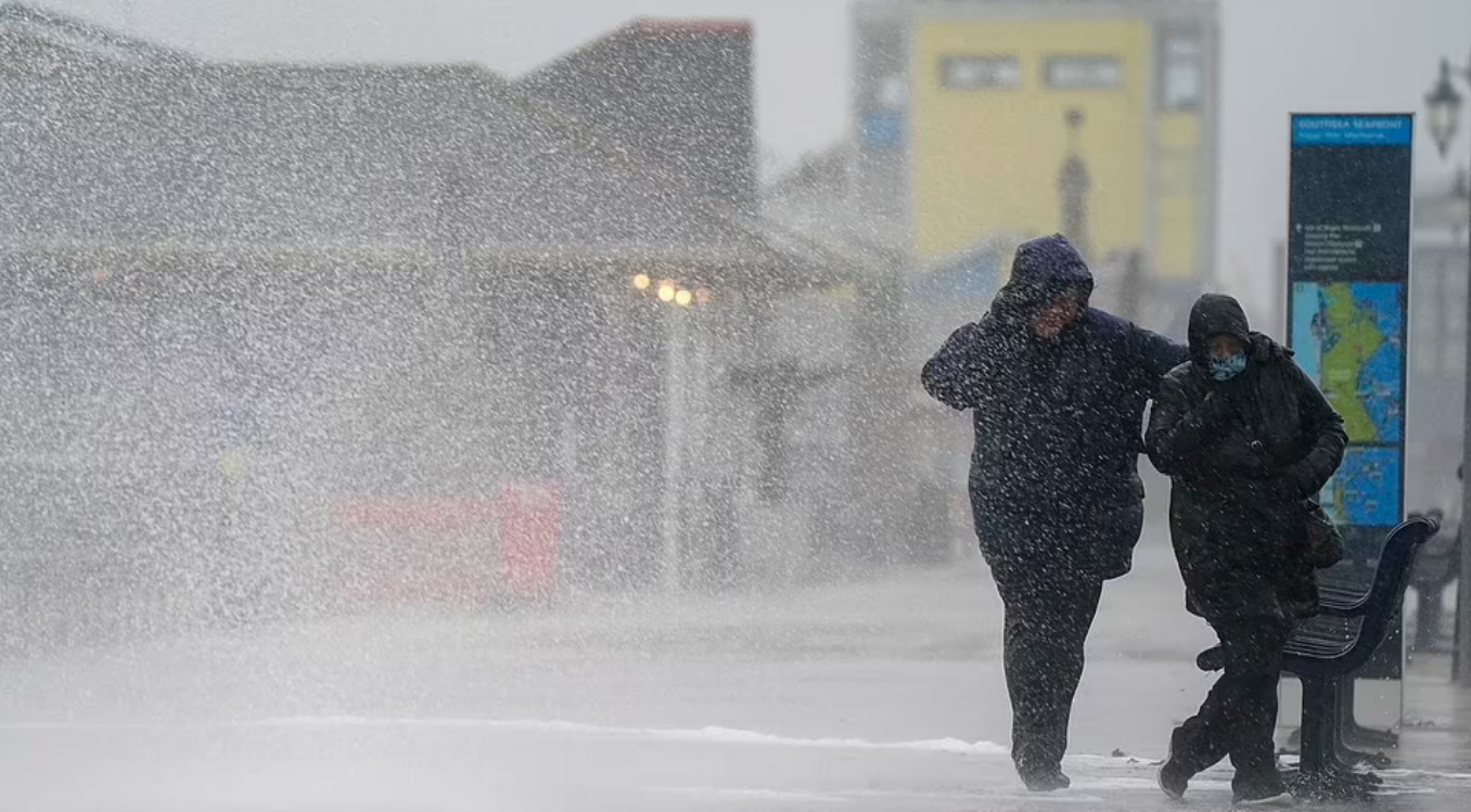Сегодня днем ​​люди борются с погодой, пока идут вдоль набережной в Саутси в графстве Хэмпшир.