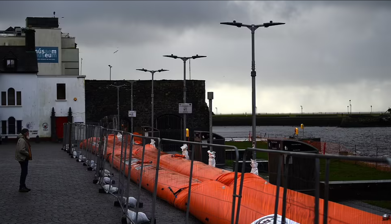 Защита от наводнения находится на месте, так как Storm Barra ​​выходит на берег в Голуэе в Ирландии.