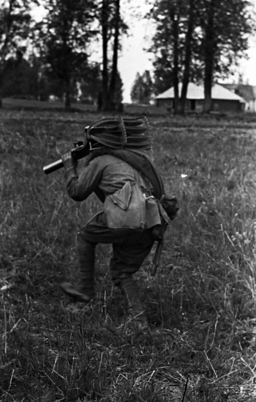 Совершает марш пехота. Это значит, что пулеметы Максима тащат, разобрав на тело, станок и 8-килограммовый щит, на себе. Станок "хорошо ложился на оба плеча", но хорошо лишь на "час-полтора": вес - 35 килограммов. Тело пулемета (благодаря уступу между коробом и кожухом) "хорошо входило в плечо", на которое взваливал его другой номер расчета, но все равно было "труднопереносимым" - 20,2 килограмма. А если в кожух залита вода для охлаждения ствола, то и 24,2; "самое трудное - тащить тело пулемета"...