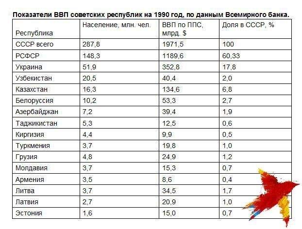 Из рассмотрения показателей чётко видно, как рухнули экономики всех республик после трагического разрушения СССР в 90-е годы.