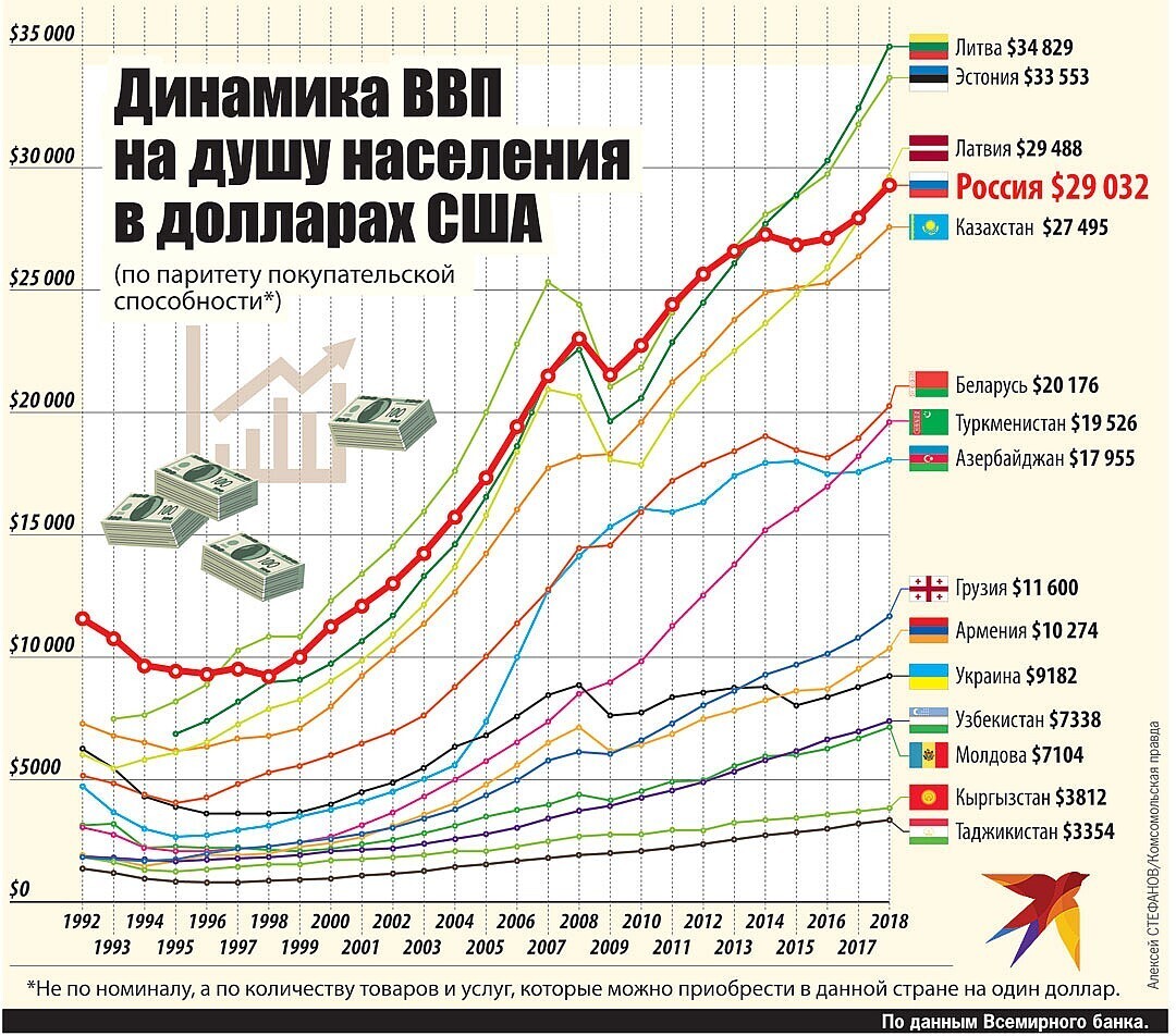 Более наглядно эти изменения можно посмотреть на другой диаграмме 1990 - 2018 гг. (в текущих долларах США).