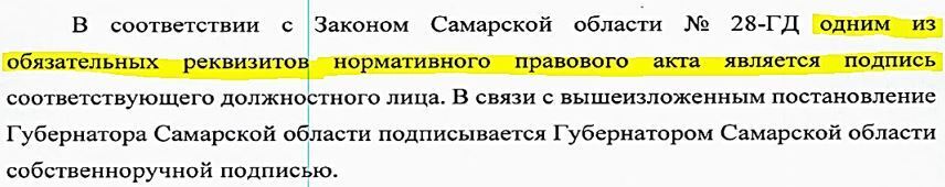 Законом Самарской области №28-ГД от 07.07.2000 г. также определено что нормативно-правовой акт - это документ (ст.1), имеющий подпись должностного лица (ст.5, п.1«е»,), а Губернатор Самарской области согласно п.3 ст. 67, ст.96 Устава Самарской области от 18 декабря 2006 г. №179-ГД обнародует законы Самарской области, удостоверяя их обнародование путем подписания.