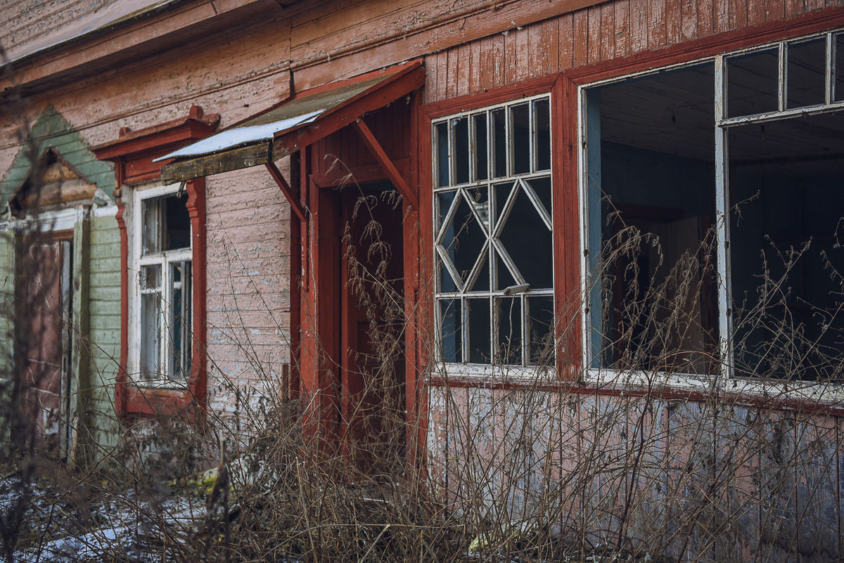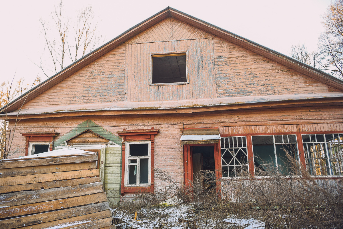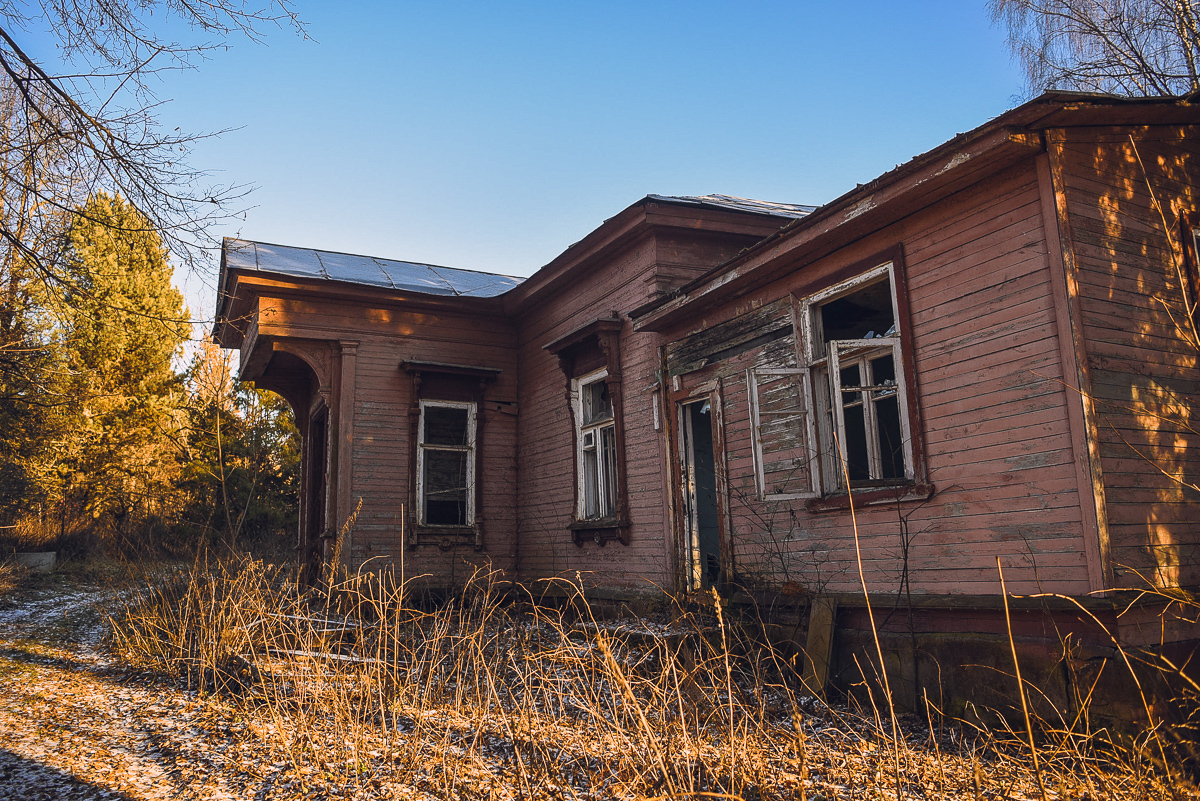Всего на её территории четыре покосившихся дома: один маленький, напоминающий обычный деревенский дом с мезонином; второй наоборот очень большой, с высоким крыльцом, громадными окнами, высоким потолком, несколькими плоскостями крыши и наличниками в стиле классицизм.