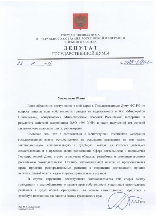 Дома, где она и сотни других людей купили жилье, строились на землях Министерства обороны. В 2005 году ведомство заключило инвестиционный контракт с застройщиком — ОАО «494 УНР». По нему, ведомство должно было отойти 20% квартир, застройщику — 80%. Квартиры в новых домах при этом продавались свободно по предварительным договорам, никаких обременений не было. Новоиспеченным хозяевам предлагалось подождать, пока застройщик закроет контракт, чтобы оформить право собственности, либо оформлять его через суд. Каждый раз, по словам Юлии, при очередном судебном заседании, извещали министерство обороны. Возражений не было.