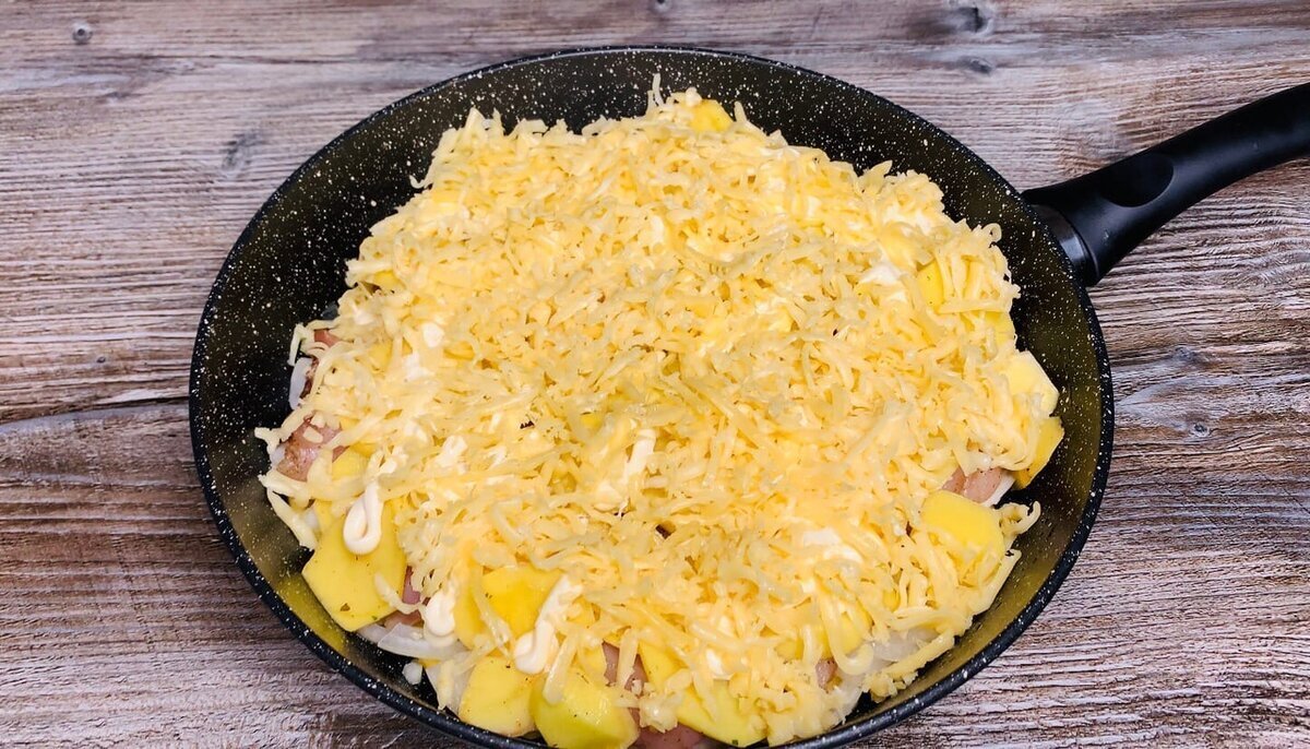 6. Сверху посыпаем всё натёртым сыром. Накрываем сковороду крышкой и ставим на плиту.