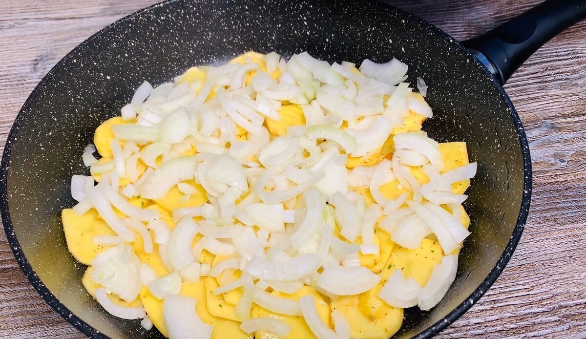 3. Лук нарезаем на четверть кольцами и добавляем поверх картофеля.