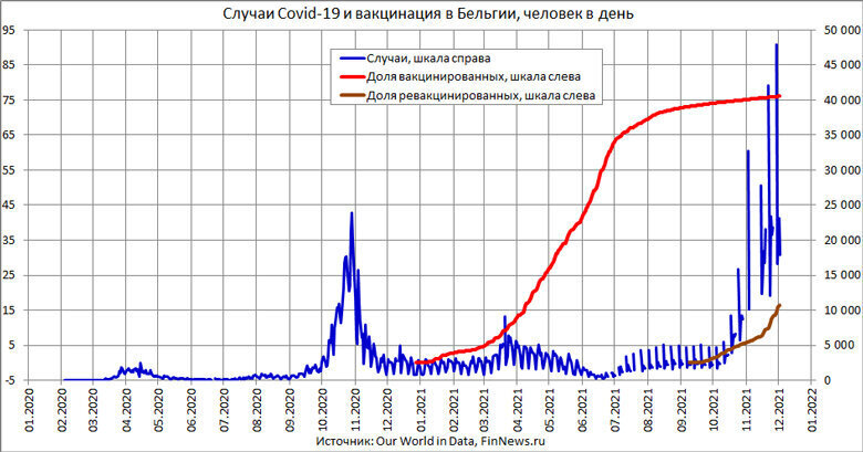 Ну, на счёт окончания ковида после вакцинации 70-75% населения нашей страны – это Александр Леонидович погорячился. Очень сильно погорячился. Например, в Бельгии привито больше 75% населения, но в стране в ноябре поставлен новый антирекорд по числу новых случаев (47 836 случаев – смотри график "Случаи заболевания Covid-19 в Бельгии и доля вакцинированных"). Например, в Голландии привито больше 76% населения, но в стране в ноябре поставлен новый антирекорд по числу новых случаев (23 783 случай – смотри график "Случаи заболевания Covid-19 в Голландии и доля вакцинированных").