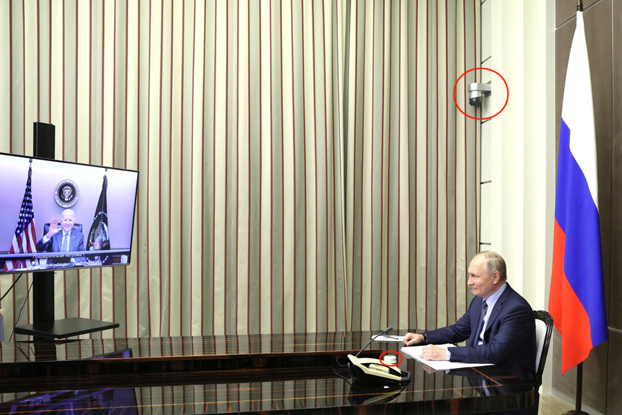Пустое это всё… А главное – на фото. В правом верхнем углу – камера слежения с обзором в 360° в секретном помещении для переговоров, на которые не позвали даже переводчика. Нет, она не для удобства видеосвязи, которую осуществляет совсем другая.