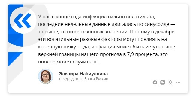 "Но, судя по предварительным данным ноября, эта устойчивая составляющая инфляции, кажется, перестала расти", — добавила председатель ЦБ.