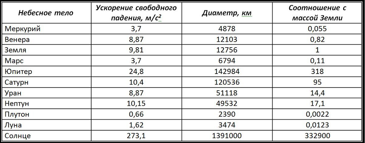Ускорение свободного падения зависит не только от массы, но и от радиуса космического тела, при равной массе чем меньше размеры тела тем больше ускорение свободного падения.
