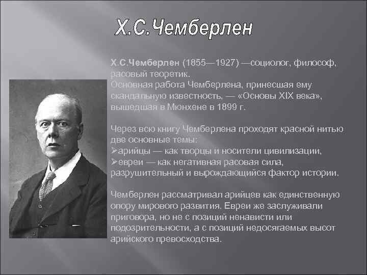 Книга Чемберлена «Основы XIX столетия», где осанны «арийской расе» густо заквашены на «тлетворной роли евреев, от времени их первого рассеяния в «вавилонском плену», до наших дней» — так и не была прочитана Гитлером. Не одолел, болезный… Но их частые личные беседы привели к увлечению «расовой философией». В нескольких корявых статьях будущий фюрер рассуждал над личной проблемой, как в национал-социализме связать три вещи: высшие добродетели «арийцев», расовую чуждость евреев и «еврейство Иисуса Христа».