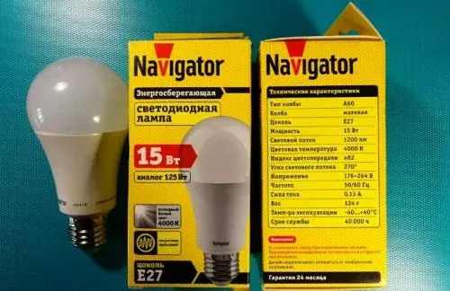 У меня подходящие лампы были дома Navigator NLL-A60-15-230-4K-E27, выпущенная 04.19. я надеюсь, что современные лампочки имеют такую же конструкцию, как и эта. У этой лампочки мощность 13.66 Вт, производит 1210 лм света, у нее нет пульсации. Она оснащена импульсным драйвером. Лампочки такого типа стоят от 120 рублей.
