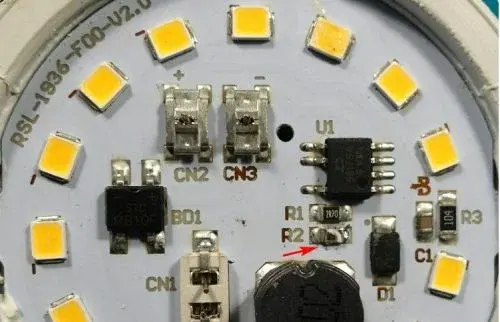 В первую очередь снимите колпак. У данной лампочки его можно оторвать рукой, только нужно приложить силу. Под колпаком одна плата. На ней нужно найти резисторы R1 и R2, они задают ток светодиодов.