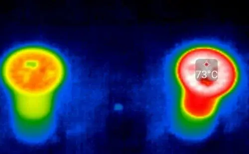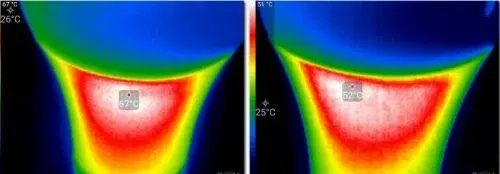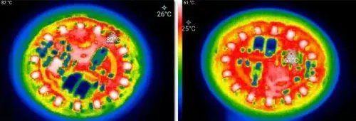 Тепловизор показывает неправильно температуру на включённых светодиодах, но для сравнения подойдет. Получается очень большая разница — 21° С.