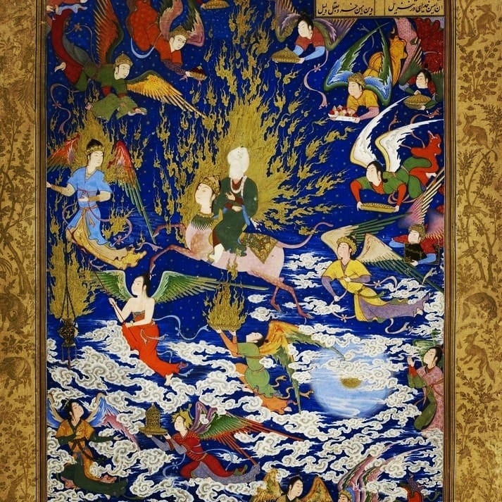 💎Лента этого поста состоит из мечетей и дворцов Ирака, Сирии, Испании, Индии. А миниатюра с пылающим всадником-это изображение Вознесения Пророка (мирадж), 1539-1543 г. Из книги "Пятерицы" (Хамсе). Низами.