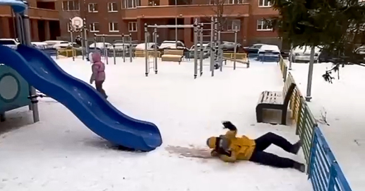 На детской площадке в Котельниках всё было хорошо пока не ударили морозы. Сейчас по ледяной дорожке дети улетают прямиком в забор.