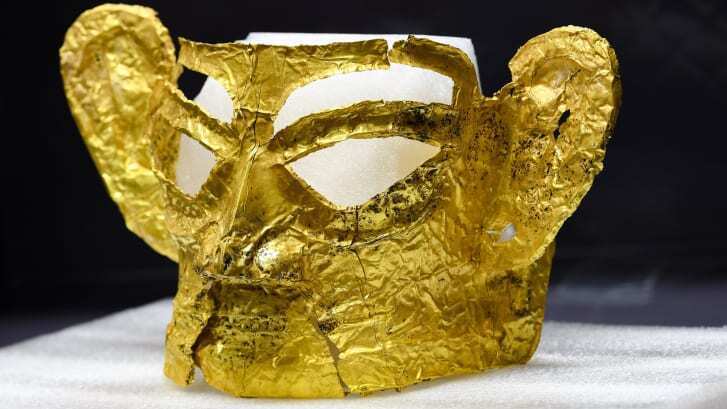 В июне легкая золотая маска была одной из примерно 500 реликвий, недавно обнаруженных в группе жертвенных ям на юго-западе Китая, на археологическом участке Саньсиндуи, расположенном недалеко от Чэнду. Тысячи артефактов были найдены на участке площадью 4,6 квадратных мили с тех пор, как местный фермер случайно обнаружил его сто лет назад. Согласно государственному агентству печати Синьхуа, маска, вероятно, была частью более крупной бронзовой головы, сделанной во времена поздней династии Шан, правление которой закончилось в 1046 году до нашей эры. Среди других находок - реликвии из слоновой кости, бронзовые статуэтки и нефритовый нож.