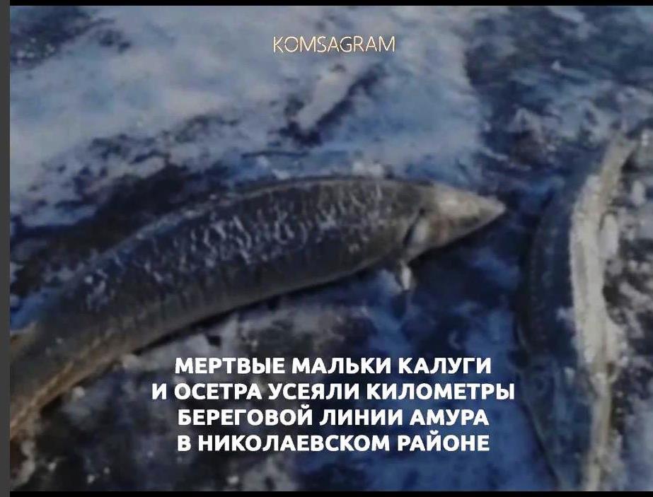 Километры береговой линии Амура усеяны мертвыми мальками осетра и калуги в Николаевском районе Хабаровского края. По мнению экологов, рыба не успела уйти на глубину и на сушу ее выдавил подъем льда. Мертвую рыбу обнаружили жители Николаевского района на берегу от мыса Хусси до села Джаоре, а это около 12 километров. По мнению экологов, обнаруженные осетр и калуга стали жертвой природной ловушки: во время ледостава ее попросту выдавило на берег.