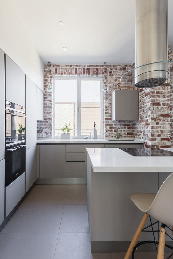 Сложность в подведении коммуникаций и удаленность от стояка — безусловные минусы. Но если «мокрая» зона позволяет сделать такую конфигурацию кухни, то выглядит это всегда беспроигрышно.