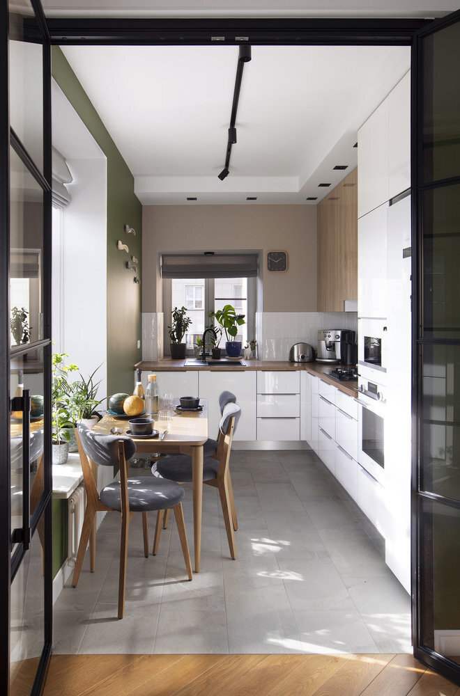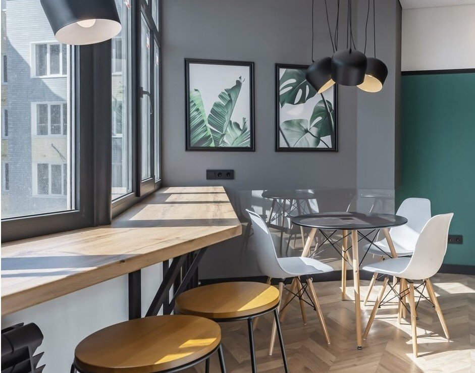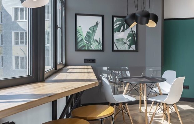 Решение, которое работает на ура. Барная стойка вместо подоконника создает и полноценное обеденное пространство, и дополнительное рабочее место, и даже место для хранения.