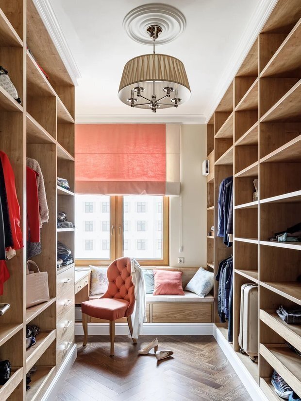 Можно оформить как продолжение подоконника, а там, где заканчивается радиатор, предусмотреть выдвижные ящики. Или расположить туалетный столик перпендикулярно окну, как на фото ниже. Из существенных плюсов — естественный дневной свет.