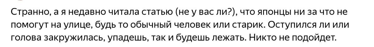 В ответ на это появилось несколько комментариев о том, что люди слышали противоположное мнение, что японцы никогда не придут на помощь, пройдут мимо и не обратят внимания.