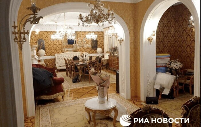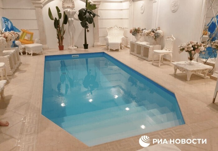 Там много золота, лепнины, статуи, хрустальные люстры, мебель в стиле ампир, бассейн с мраморным полом.