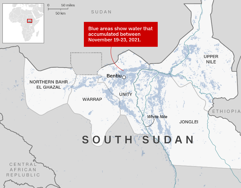 В течение многих лет Южный Судан переживает более влажные, чем обычно, влажные сезоны, в то время как его засушливые сезоны становятся еще более засушливыми. Сезон дождей закончился, но вода, которая накапливалась за несколько месяцев, еще не отступила.
