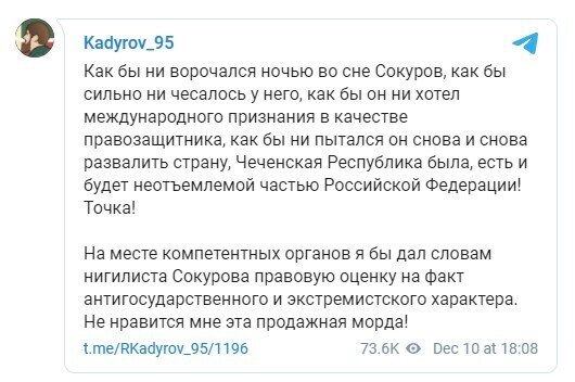 «Как бы ни ворочался ночью во сне Сокуров, как бы он ни хотел повторно развалить страну в качестве правозащитника, как бы он ни пытался снова развалить страну, Чеченская Республика была, есть и будет неотъемлемой частью Российской Федерации! Точка», – написал Кадыров в своем Telegram-канале.