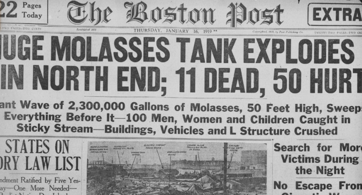 Но в январе 1919 года именно это произошло в городе Бостон, штат Массачусетс, когда взорвался контейнер с патокой высотой 50 футов, и в этом не было ничего даже отдаленно смешного.