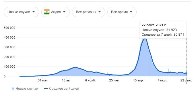 Вот теперь и Индия присоединилась к Китаю. После 400 000 заболевших в сутки у них вдруг все опустилось до 20-30 тысяч. А в СМИ вообще появилась информация о том, что власти 200-миллионного штата официально заявили всего об 11 новых больных за сутки.