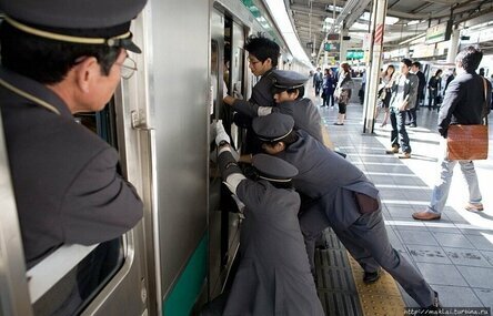 По-другому трамбовщик пассажиров называется осия. Переводится такое странное название как «толкать». Эту профессию можно встретить только в 2 х городах – Токио и Мадрид.