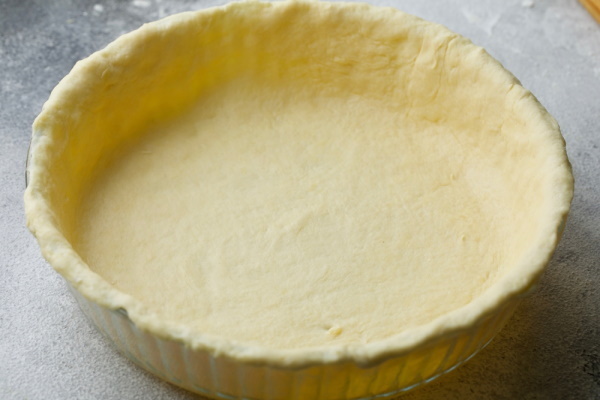 6. В форму для выпечки выложите основу из теста, формируя бортики. Сделайте множественные проколы вилкой. Отправьте основу выпекаться в духовку на 20-25 минут.