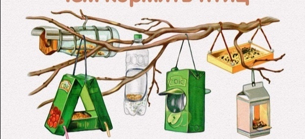 На этом слайде показаны кормушки для птиц, которые выполнены из подручных материалов.