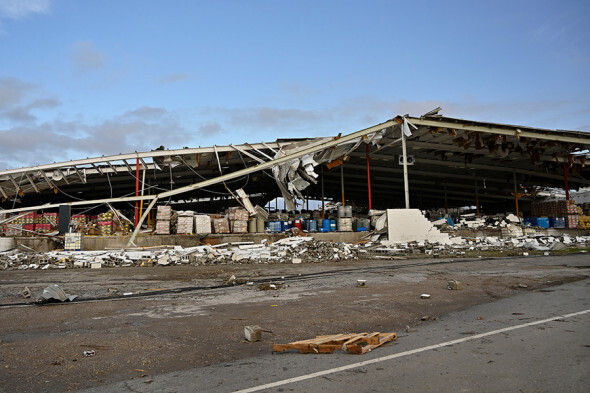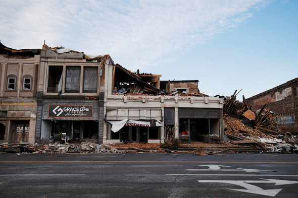 Разрушенные торговые ряды в Мэйфилде, штат Кентукки