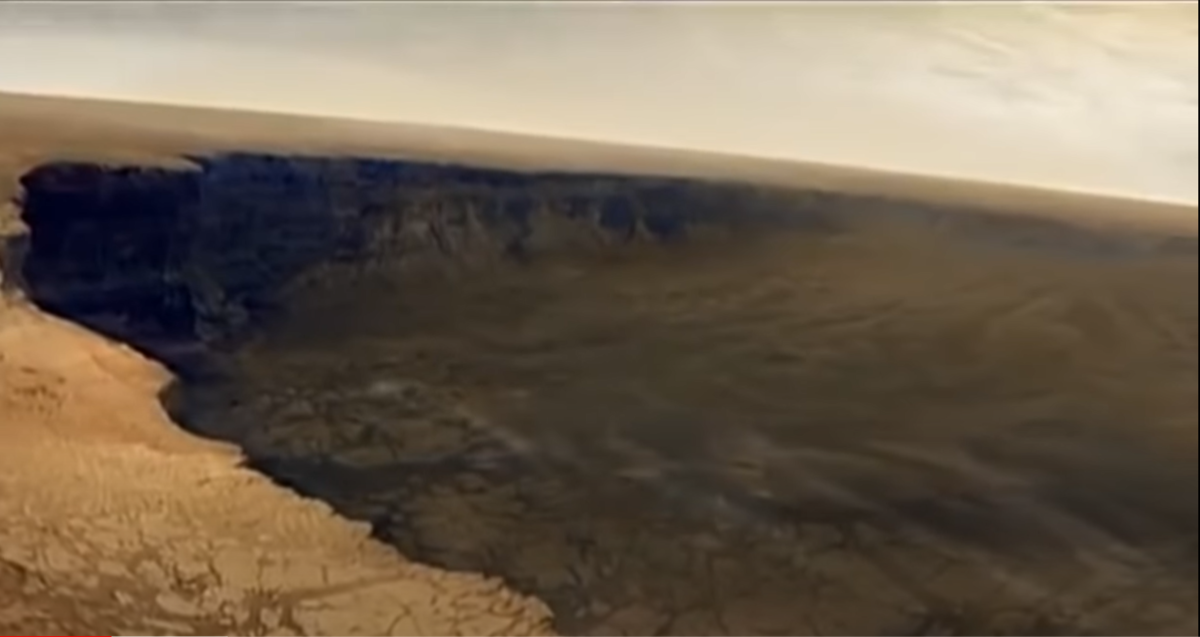 Кратер длиною в 10 000 километров образовался после удара с неким крупным космическим объектом. После чего симметричность полушарий планеты стали ассиметричны.