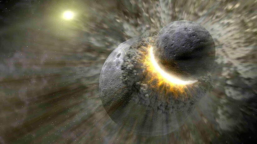 Третья теория гласит, что планета может получить свой спутник в результате столкновения с другим массивным объектом. При столкновении огромное количество вещества может быть выброшено на орбиту планеты и со временем образовать спутник, вращающийся вокруг планеты, также как это происходит с веществом аккреционного диска. Это наиболее вероятный сценарий образования нашей Луны: Земля несколько миллиардов лет назад столкнулась с объектом размером с Марс, во время чего вещество было выброшено в космос и подобрано гравитационным полем Земли, а со временем из этого вещества образовалась Луна.