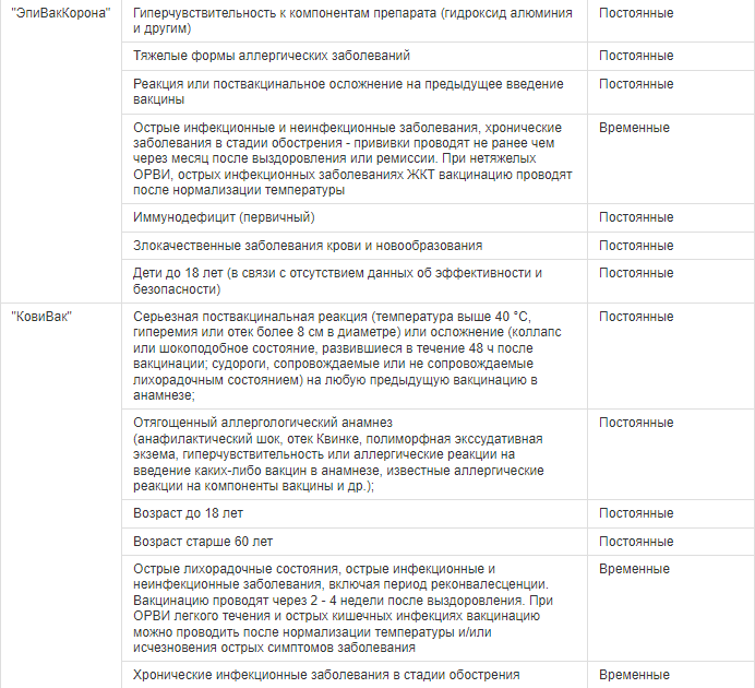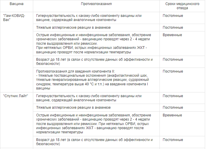 В соответствии с письмом Минздрава России от 24.08.2021 № 30-4/И/2-13481 «О новой редакции Порядка проведения вакцинации взрослого населения против COVID-19» (вместе с «Временными методическими рекомендациями «Порядок проведения вакцинации взрослого населения против COVID-19») в список противопоказаний к вакцинации против новой коронавирусной инфекции COVID-19 включены следующие состояния: