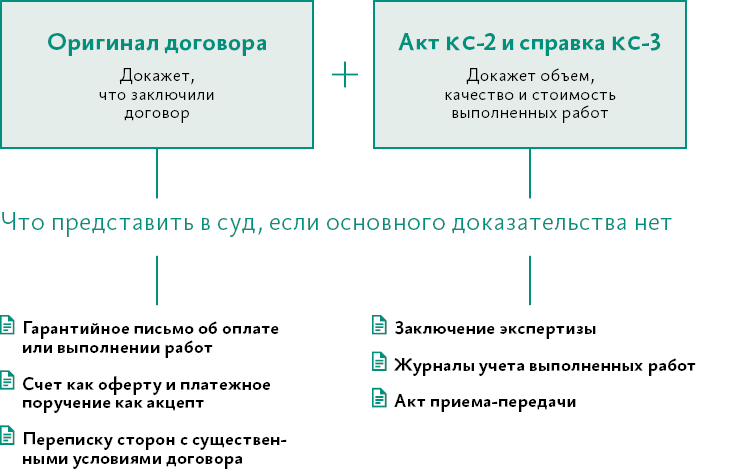Если актов КС-2 и справок КС-3 у вас нет, подтвердить или опровергнуть реальность выполнения работ, их объем, качество и стоимость можете с помощью иных доказательств. Какие документы нести в суд, узнаете далее.