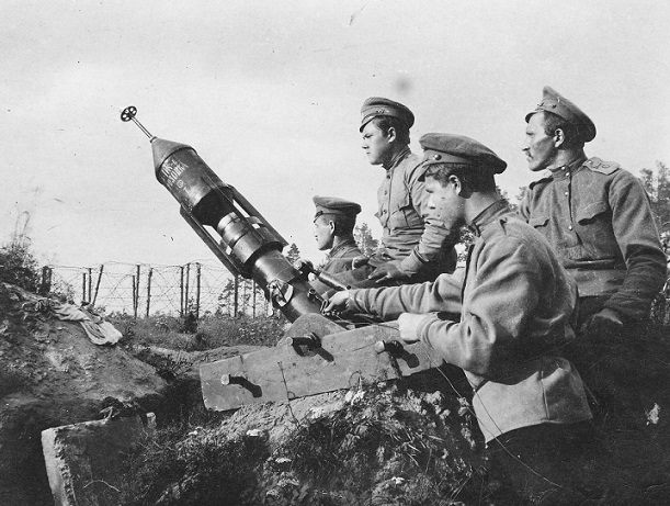 Сконструировал надкалиберную мину со стабилизатором буквально из подручных средств. Стволы морских 47 мм орудий закрепил на колесных лафетах. Когда же их не хватило, приспособил просто металлические трубы на деревянных колодах. Вместо обычных снарядов использовал самодельные шестовые мины, что выпускались под углом от 45 до 85° по навесной траектории, и могли уничтожать закрытые цели, недоступные ружейно-пулеметному и артиллерийскому настильному огню.