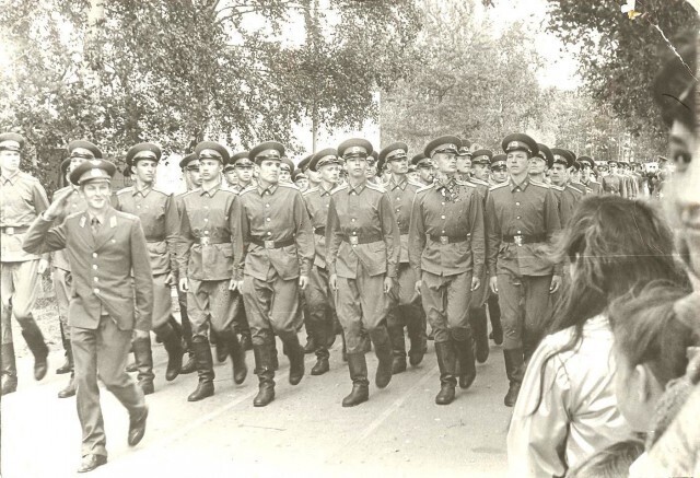 На фото - КМБ (не путать с ДМБ, гыы) - 1982. Праздник - День авиации. Деревянные солдаты Урфин Джюса в новеньком х/б. Я - в первой шеренге, из-за роста. Меня легко найти - в отличие от всех, старательно выполняющий команду: "Равнение нале-ВО!", я устремил свой взор, почему-то, совсем в иную сторону. Увы, сейчас уже и не вспомнить - почему.